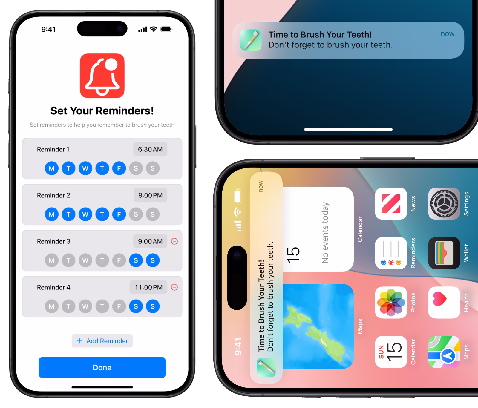 With Brush Em', you can set reminders to brush your teeth, ensuring you never forget. Set a reminder for whenever you want, and Brush Em' will remind you to brush your teeth at the time you set.
