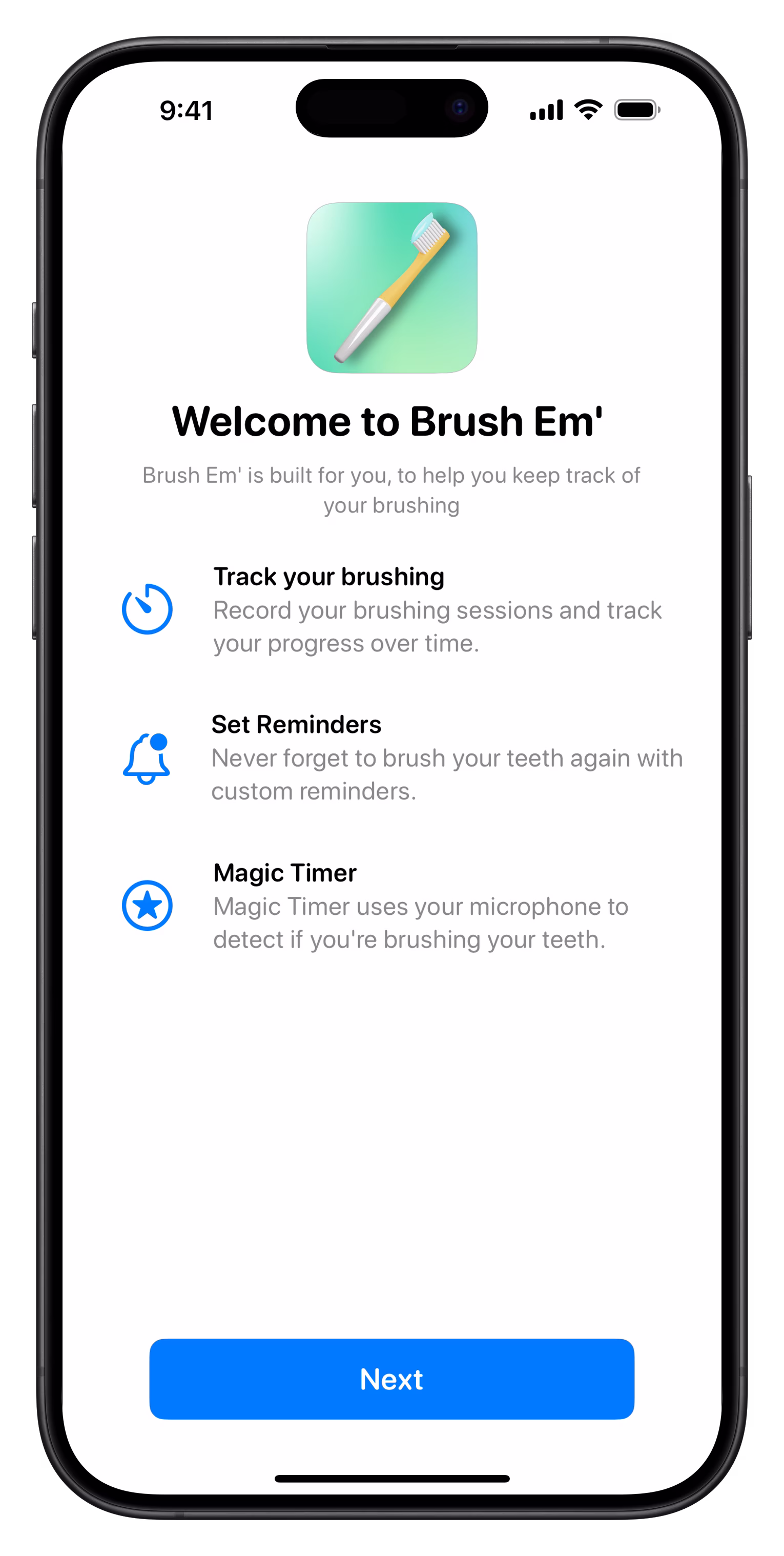 Using Magic Timer, Brush Em' can automatically start a timer when you start brushing. This way, tracking your brushing is as simple as opening the app and starting to brush! And it's all processed on-device, so your data stays private and secure, giving you the privacy you deserve!